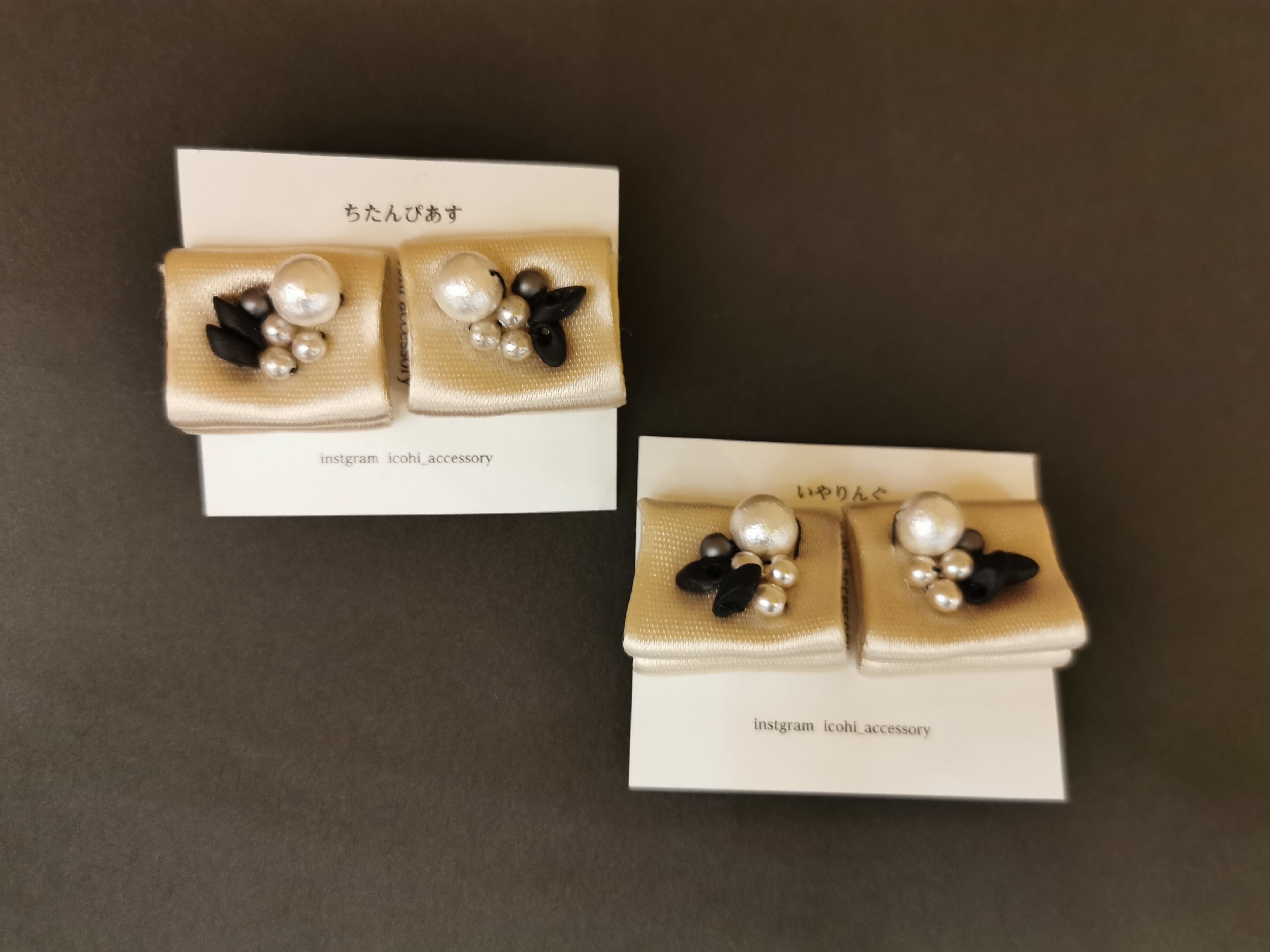 光沢のあるリボンを使用し、華麗に咲く花に止まる小鳥をイメージしたピアス、イヤリングです。