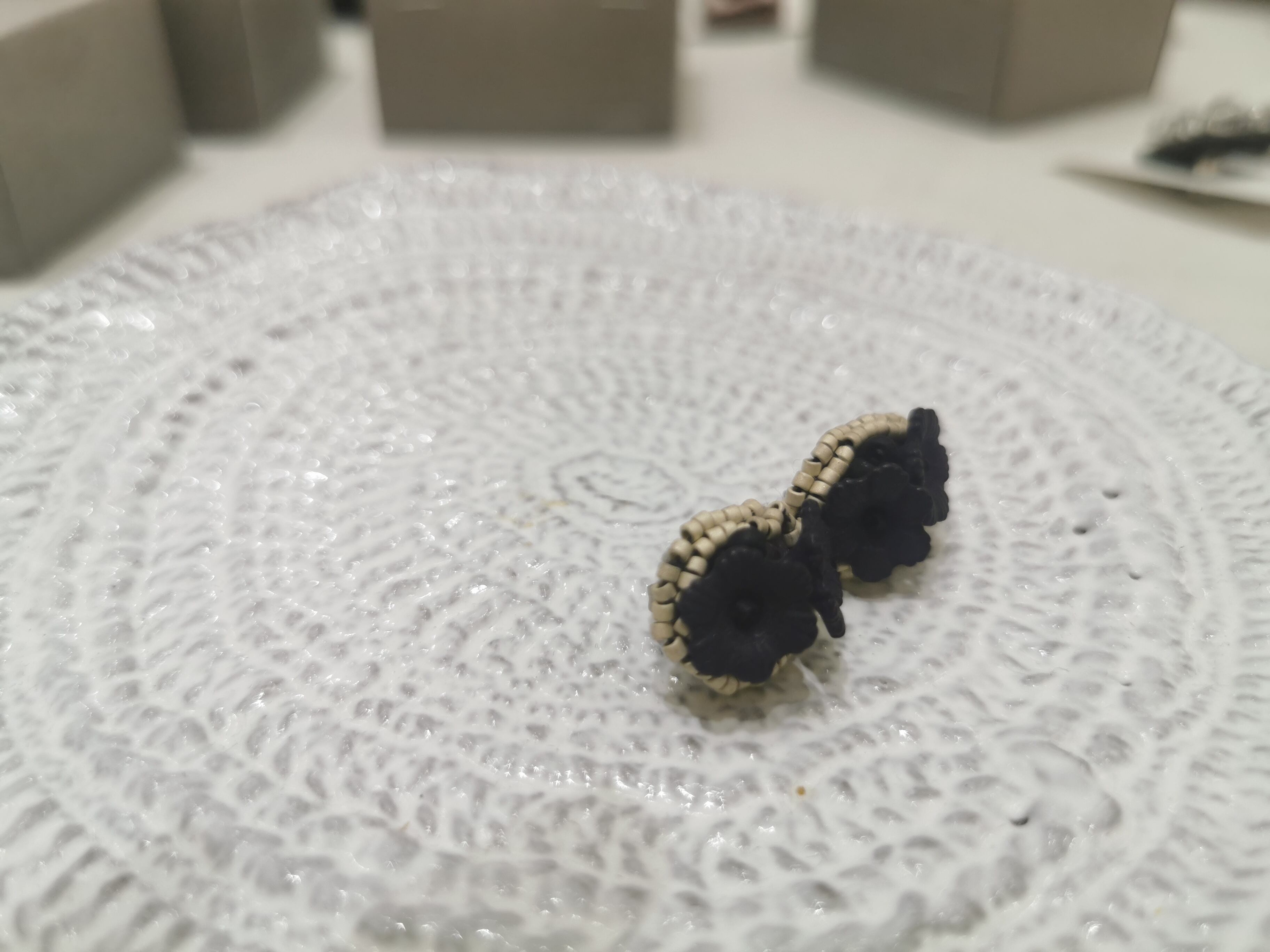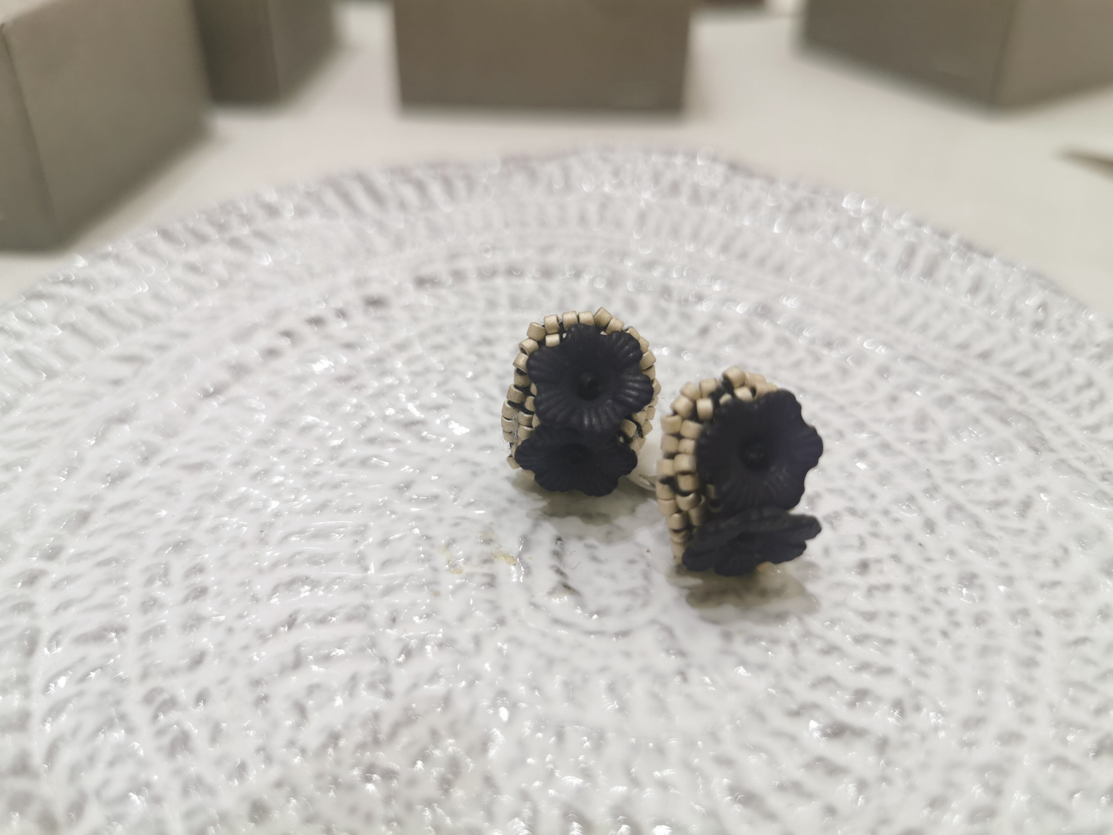 ビーズ、黒い花2つを一針一針縫い込みました。 縦 約2センチ 横 約1.5センチ